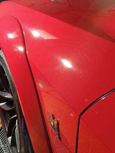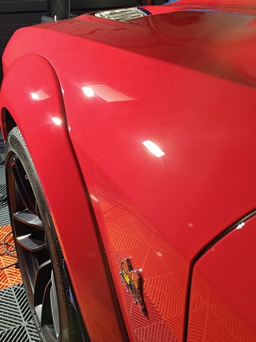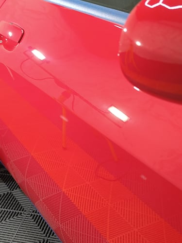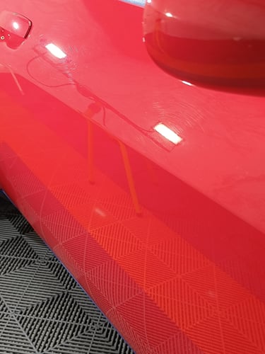 Tout d’abord, un polissage approfondi a été effectué pour éliminer les micro-rayures présentes sur la carrosserie. Cette étape essentielle a permis de raviver la profondeur de ce rouge uni et la brillance du vernis.