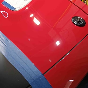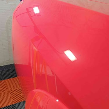 Tout d’abord, un polissage approfondi a été effectué pour éliminer les micro-rayures présentes sur la carrosserie. Cette étape essentielle a permis de raviver la profondeur de ce rouge uni et la brillance du vernis.